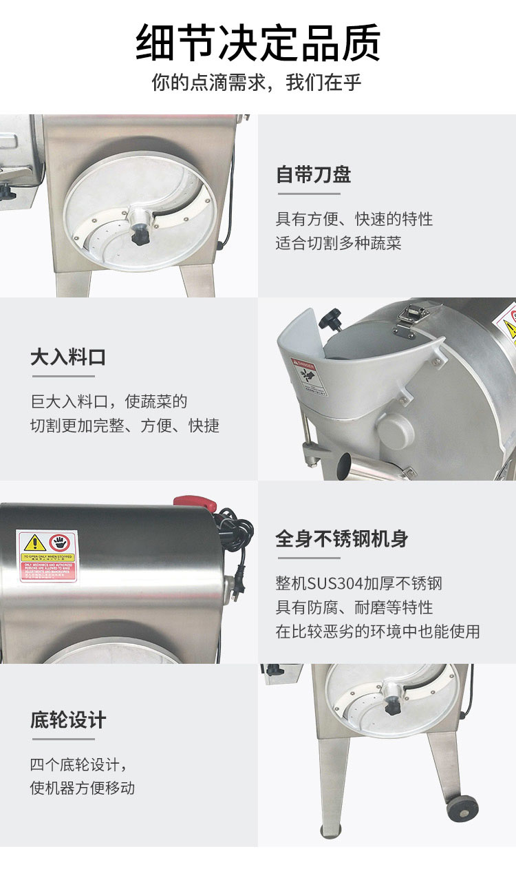·多样功能:将根茎类:土豆、萝卜、红薯、笋类、洋葱、 茄子、莴笋、黄瓜等根茎类果蔬 切片、丝、丁,适合卫生餐饮人员或食品加工厂使用。